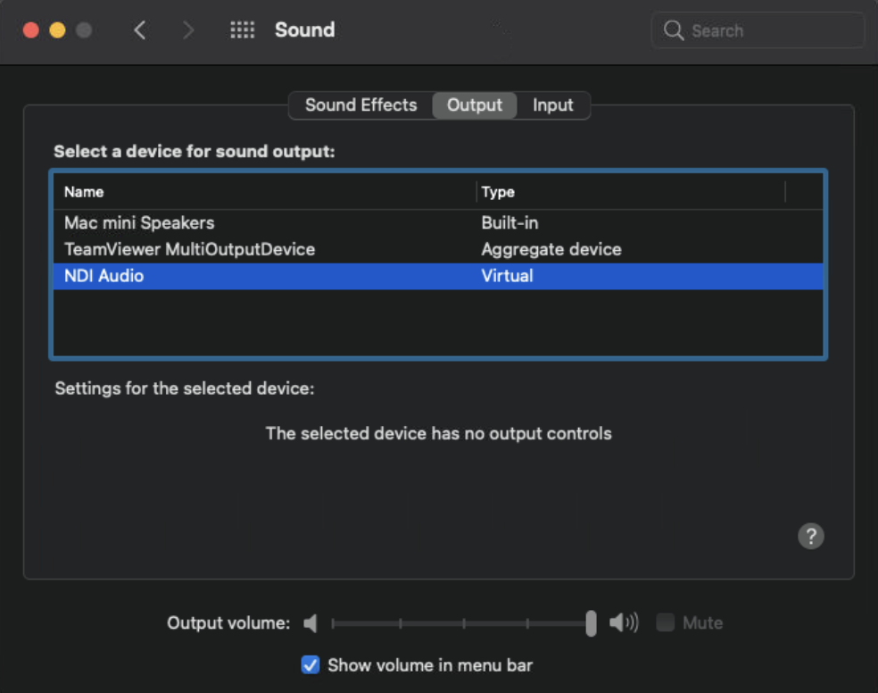To stream the playback from Final Cut Pro, go into your System Preferences on the Mac and set the Sound > Sound Output as the NDI Audio. For the configuration of the video, search NDI Output in the System Preferences and set the video format and frame rate to be the same as your Final Cut Pro project.
