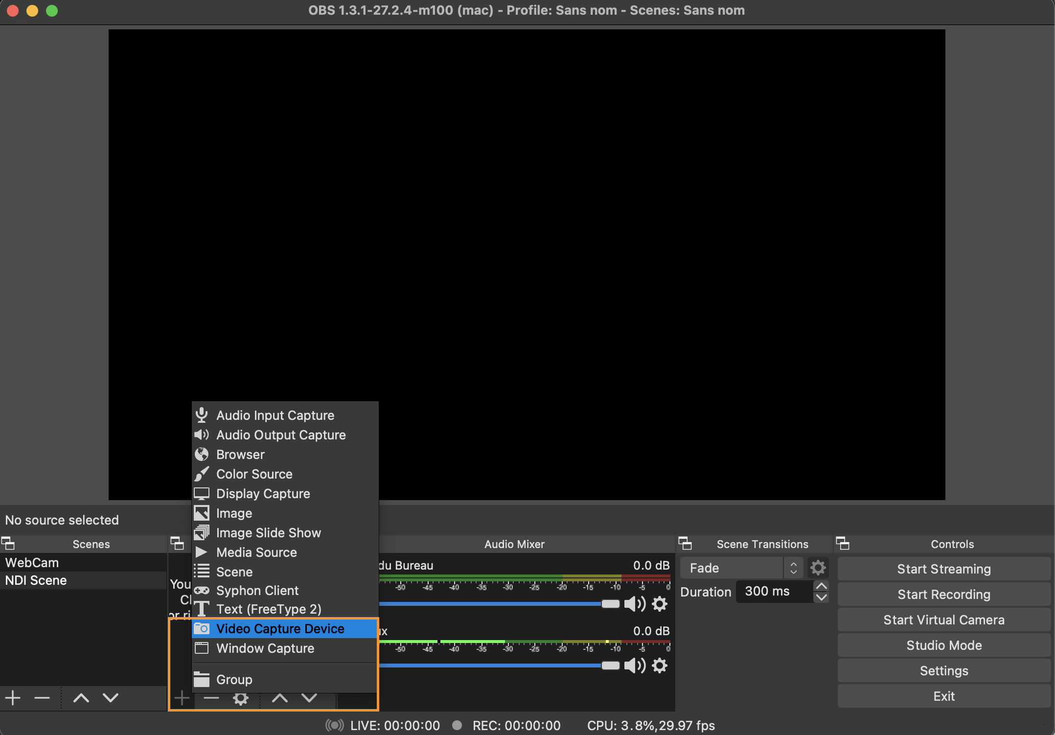 With a scene created, a source needs to be added. Press on the "+" of Sources and select Video Capture Device and create a new label for the camera.