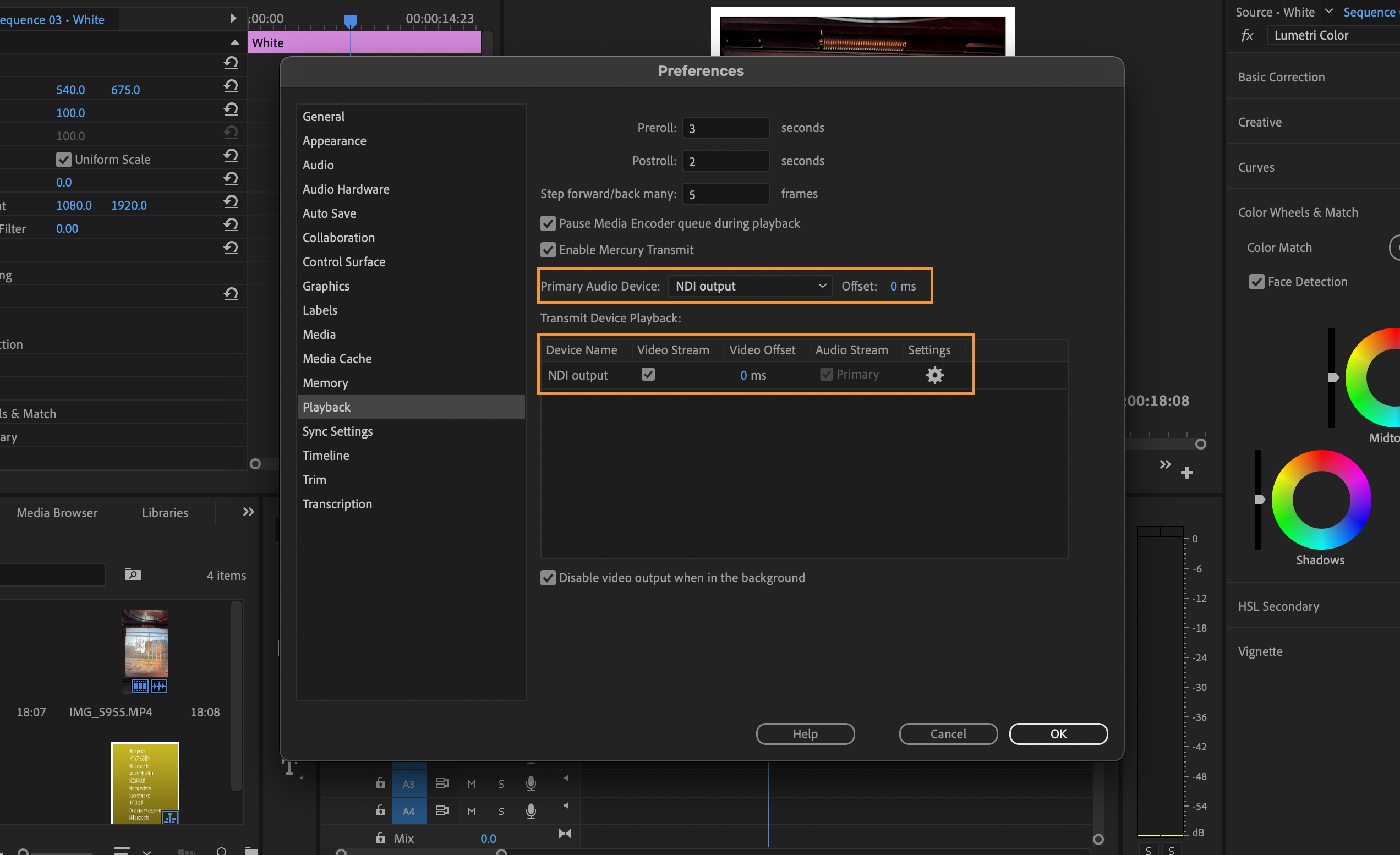 Enable NDI in the Video Preview section with NDI Output selected in the Audio Device list as well as the Video Device list.
