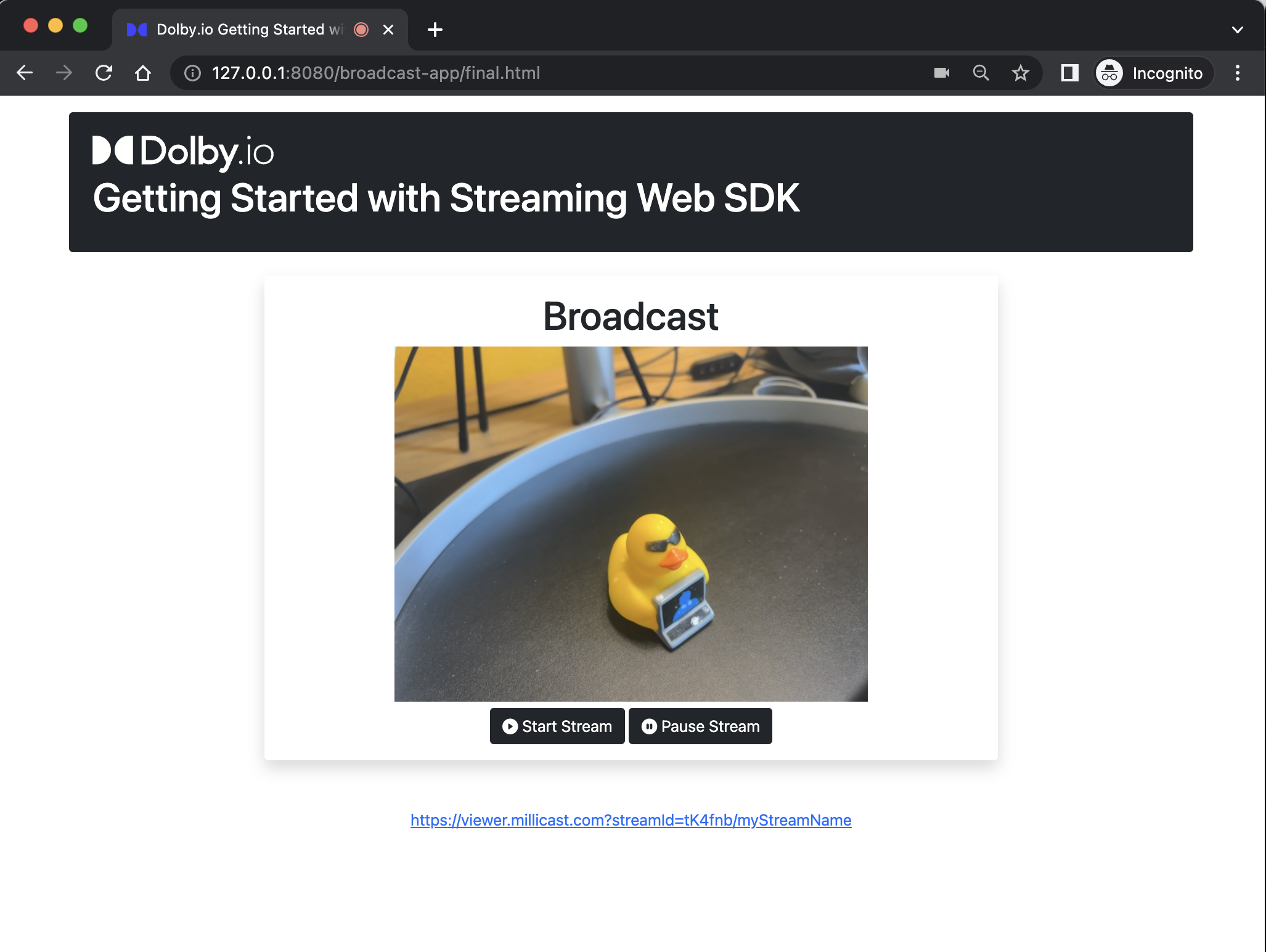 Clone the repository dolbyio-samples/stream-sdk-web-getting-started as described in the first section but this time we'll be working the with broadcast-app folder. You can view the app locally using the same tools described in the previous section.