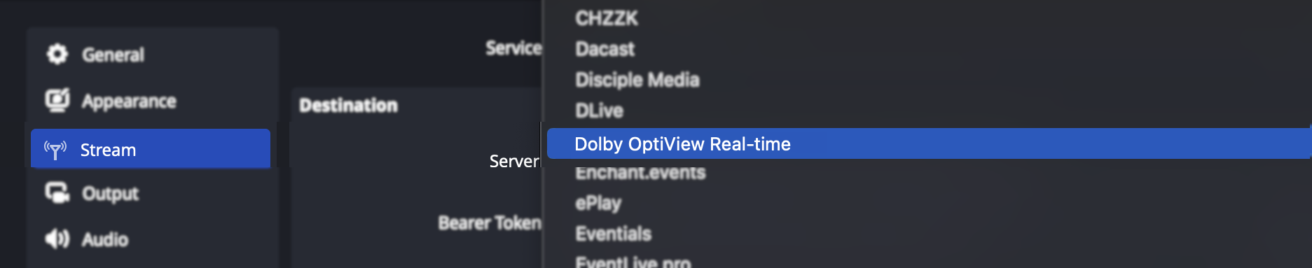 The Dolby OptiView Real-time Service was added as a Stream option in more recent releases (after 30.x) of OBS.