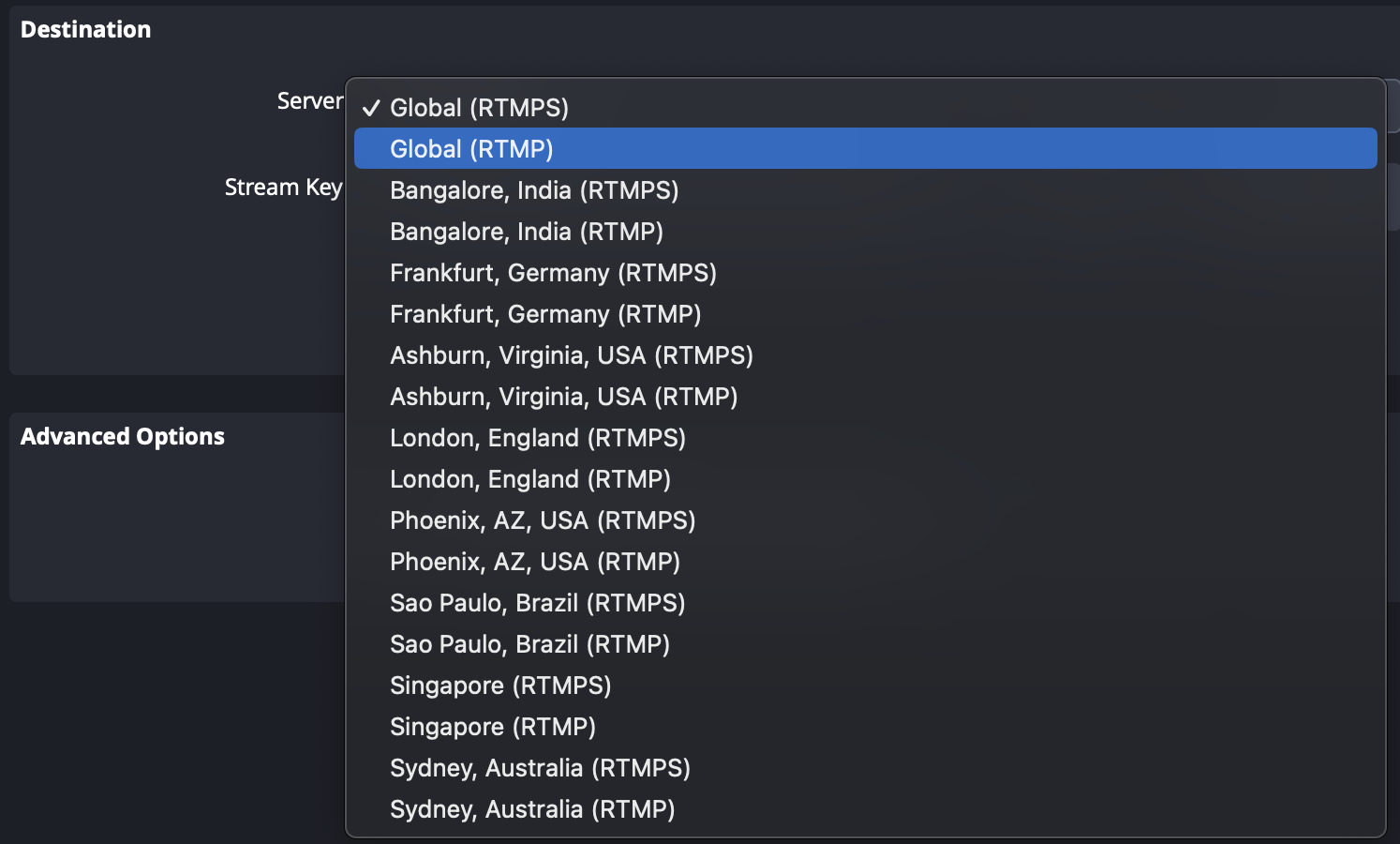 From the Server dropdown menu, you can select Global to have your broadcast location automatically determined or choose from any of our cluster regions.