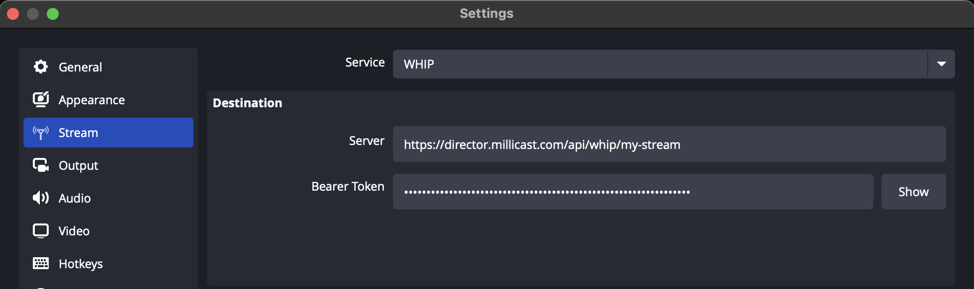 | Bearer Token | This should be set to the WHIP Bearer token. |