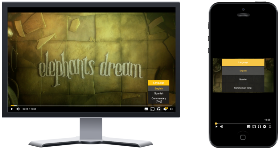 THEOplayer has a default user interface (UI). The default UI is optimized for browsers, mobile devices and tablets. As a developer, you may A) use this UI as is, B) customize it, or C) create a brand-new Chromeless UI, as depicted in the screenshot below.