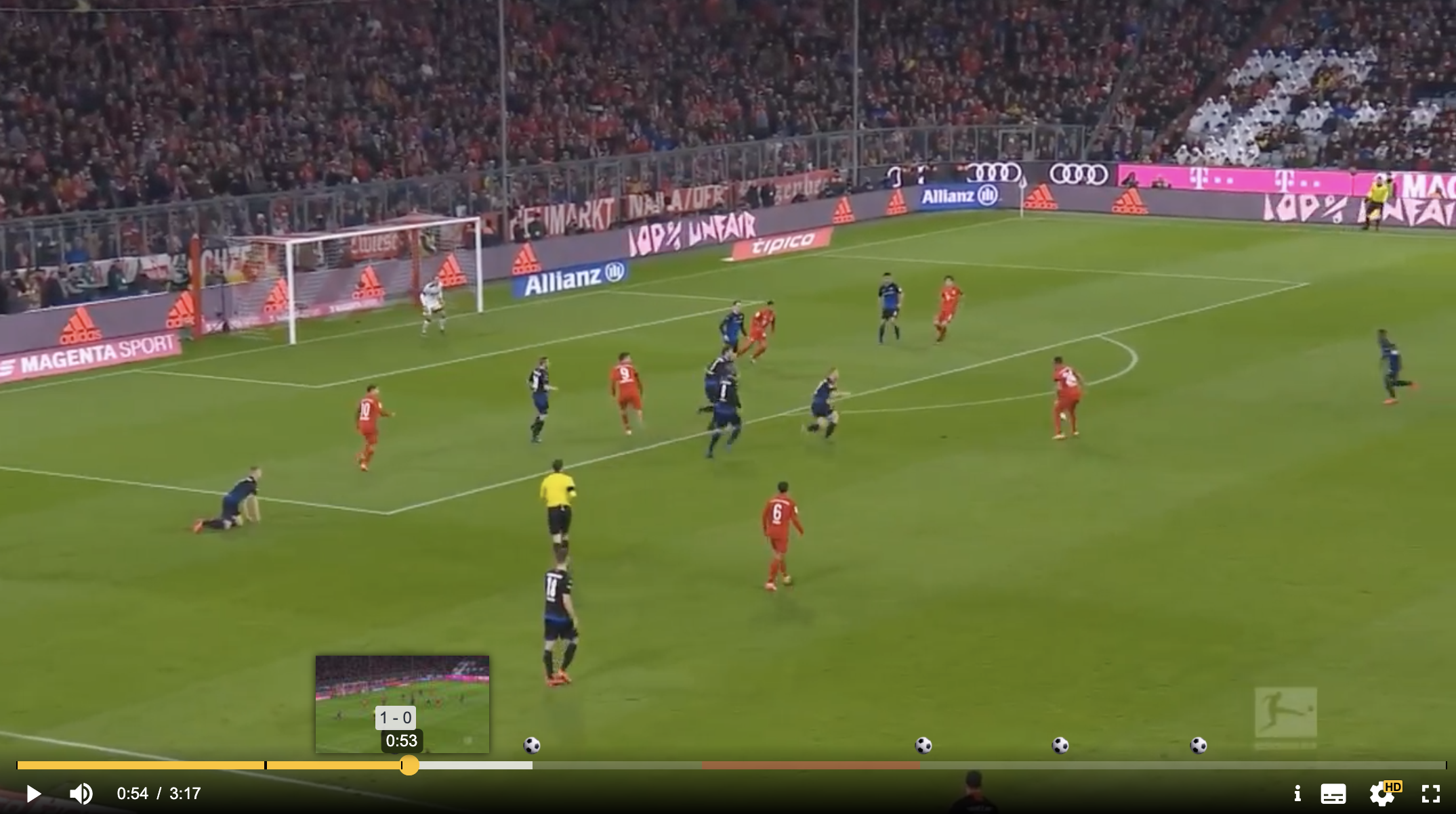 For example, in the screenshot above, we're leveraging metadata to highlight where a goal has been scored. If you click on the goal icon, you'll be taken to this moment in time in the video. You could of course expand this feature, and hovering the goal icon would toggle a tooltip which tells you who scored and what the new score is.